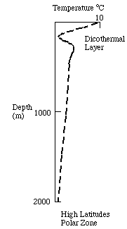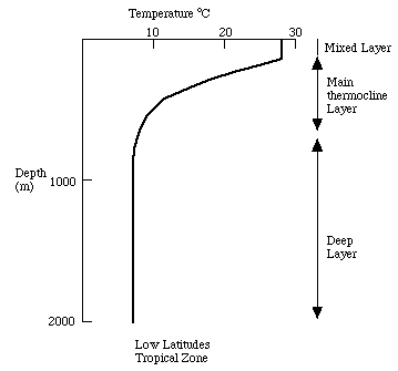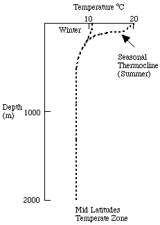 Seasonal effects are limited to a narrow range of depths in the ocean by the extent of vertical mixing. A ìseasonalî thermocline may develop in some regions (mid and high-latitudes) from the surface to about 200 m depth in response to heating by the atmosphere. Summer warming accentuates the thermocline by diminishing the density of the surface layers, while winter cooling erodes the thermocline and establishes the mixed layer. The depth range from below the seasonal thermocline to about 1000 m is known as the ìpermanentî or oceanic thermocline. This is the transition zone from the warm waters of the surface layer to the cold waters in the deep ocean. The ìpermanentî thermocline is consistently present extending from 100ñ1000 m depth at low latitudes and from 200ñ1000 m at mid latitudes. However, no permanent thermocline is established at high latitudes (polar regions).