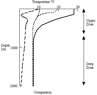Although the temperature in the upper zone shows seasonal and regional variations in response to the local climatic conditions, the deep zone remains fairly constant in both these respects with a well defined temperature-salinity relationship. Most types of XBT are designed to measure the vertical temperature structure in the top 450 m to 750 m of the water column so they do not generally extend far into the deep zone.