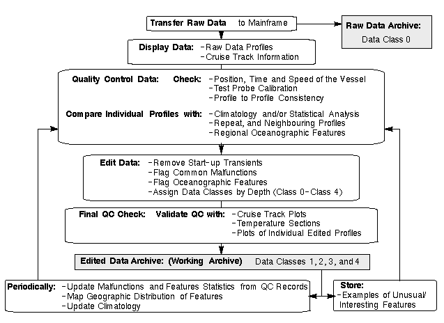 The CSIRO XBT Quality Control process uses a visual approach combined with an interactive editor to check and flag the data. The header information is tested for correct time, position and other operator errors. The vertical profiles are inspected for common malfunctions, regional oceanographic features, drop to drop consistency along the cruise track, and repeat drops of unusual features. Features may be further checked with CTD data as opportunities arise. Figure 2 shows the steps involved in the CSIRO quality control process. All unedited/raw data is stored in a separate archive for future reference if required.