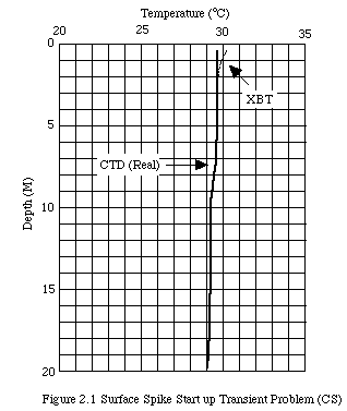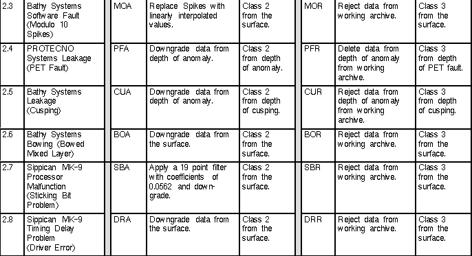 The profile data is then edited to remove start-up transients (see section 2.1) and other malfunctions, and to flag real oceanographic features. Depending on the severity of the problem, the data quality may be downgraded. The XBT profile data are classed (0-4) by depth according to the type of quality control flag(s) associated with the data. The grading system is outlined in Table 1, "Data Quality Classes". All modifications that are made to the data are reflected in coded quality flags. Anomalous features present within the profile data are flagged to indicate whether the feature is a real or probable oceanographic feature, or whether it is a possible or definite malfunction. Table 2, "Summary of CSIRO Quality Control Codes" outlines the codes (flags) which may be assigned to features and malfunctions observed in the XBT data during the CSIRO quality control process. Results of the profile QC process are recorded and stored in association with each temperature/depth pair.