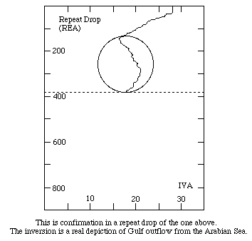 Once the header information has been validated, the individual profile plots are inspected for common malfunctions, regional oceanographic features and profile to profile consistency. Unusual features are cross validated by comparison with repeat or neighbouring profiles, and by using an archive of previously observed oceanographic features in particular regions. Doubtful features can appear and be flagged at any point in the profile. If anomalous features are present, the operator should question the validity of the profile(s) and when in doubt always look at a repeat or neighbouring drop for confirmation. A repeat drop is an XBT that has been done within 15 minutes (or 10 km) of another drop and a neighbouring drop is an XBT that is within 100 km of another drop. Care must be taken in labeling features as doubtful, since variations in thermal structure do exist, particularly in regions of oceanic fronts and eddies. Variations can also occur in less dynamic regions. Checking profiles with repeat or neighbouring drops and against an archive of regionally observed oceanographic features should be done on a regular basis. All profiles are also checked against Levitus climatology (Levitus, 1982) and/or a climatology that has been constructed from the CSIRO archive of XBT data.